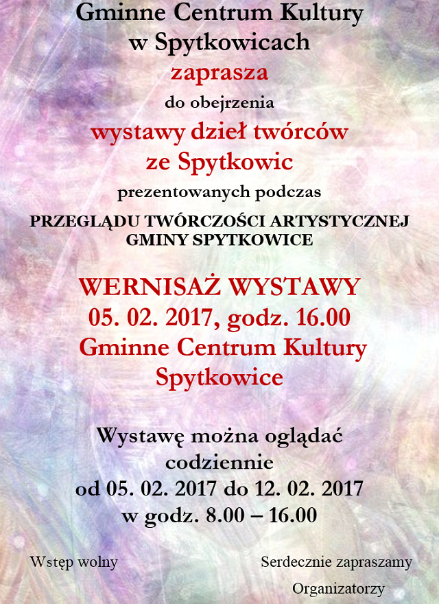 Jednoczenie chcielibyśmy zachęcić artystów tworzący na terenie Gminy Spytkowice do zgłoszenie się do Gminnego Centrum Kultury w Spytkowicach do dnia 3 lutego 2016r, w celu przekazania swych dzieł na wystawę.