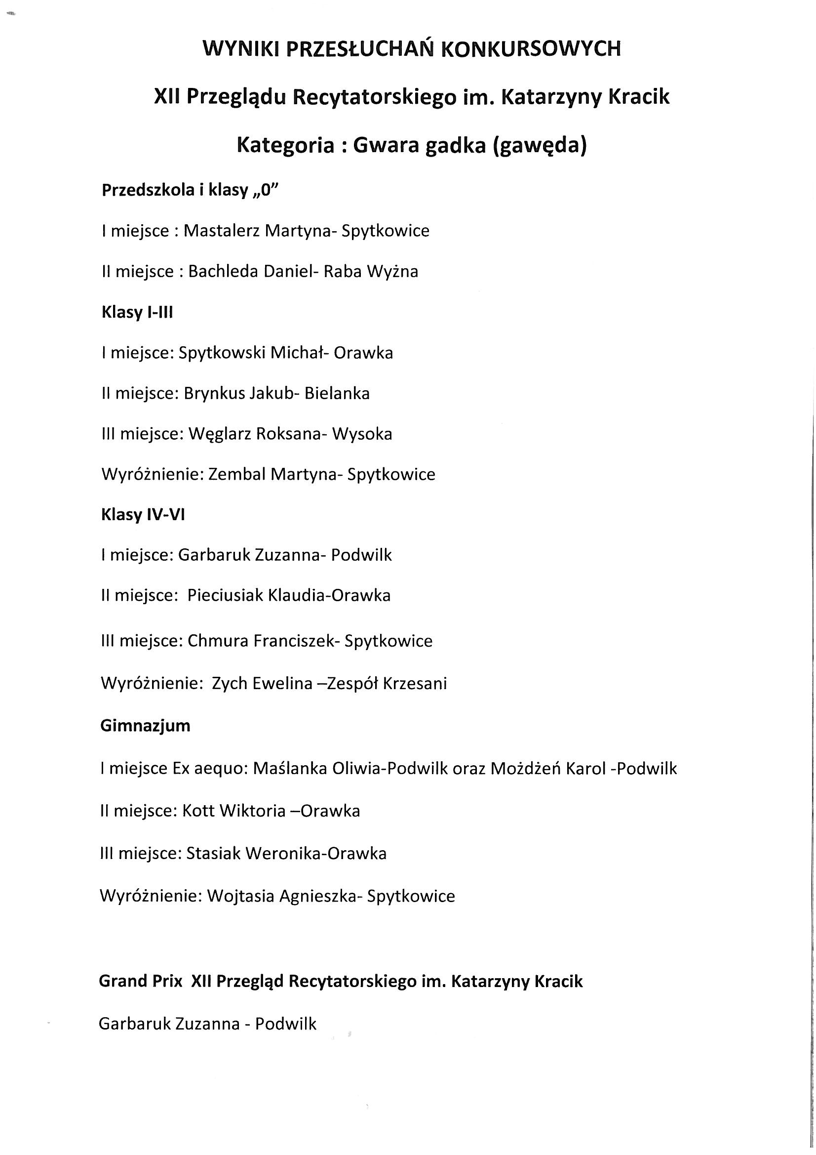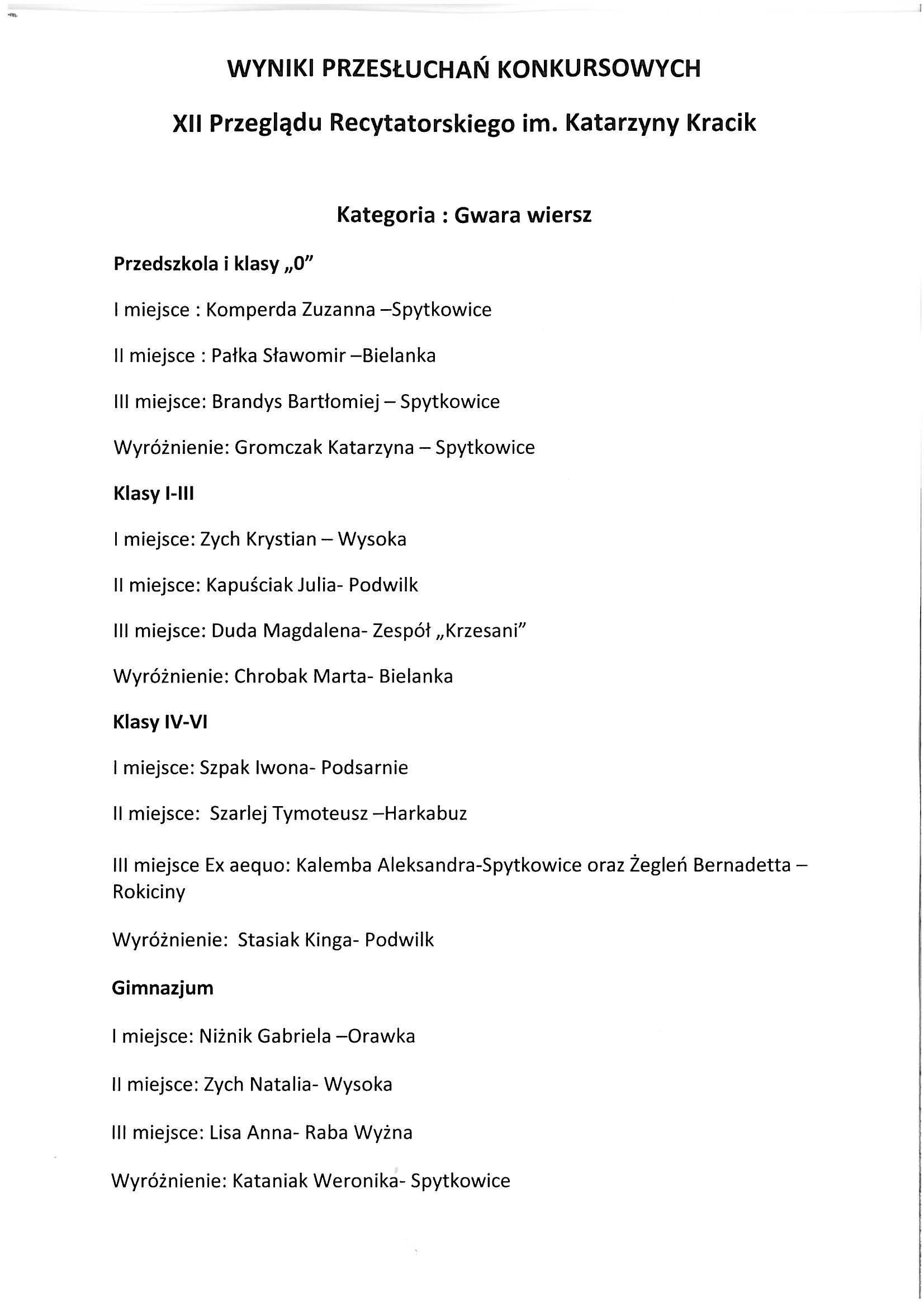 W dniu 3 października 2014 roku odbył się kolejny, już XII konkurs poetycki im. Katarzyny Kracik. Na tegoroczny konkurs zgłosiło się 63 uczestników z sąsiednich szkół i przedszkoli : Bielanki, Spytkowic, Podwilka, Podsarnia, Wysokiej, Harkabuza, Raby Wyżnej, Rokicin Podhalańskich i Orawki. Ponadto zespół regionalny „Krzesani” pod przewodnictwem Pani Beaty Rzeszótko wystawił swoich uczestników do rywalizacji w konkursie. Uczestnicy recytowali utwory w dwóch w kategoriach gwarowych, podzielonych na wiersz i gadkę-gawędę. Uczestnicy podzieleni byli również na kategorie wiekowe: przedszkola i klasy „0”, szkoły podstawowe klasy I - III, szkoły podstawowe klasy IV-VI oraz gimnazja.