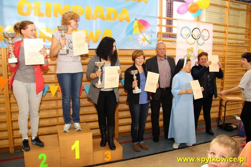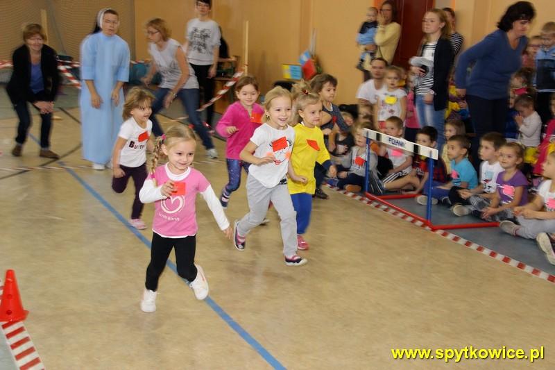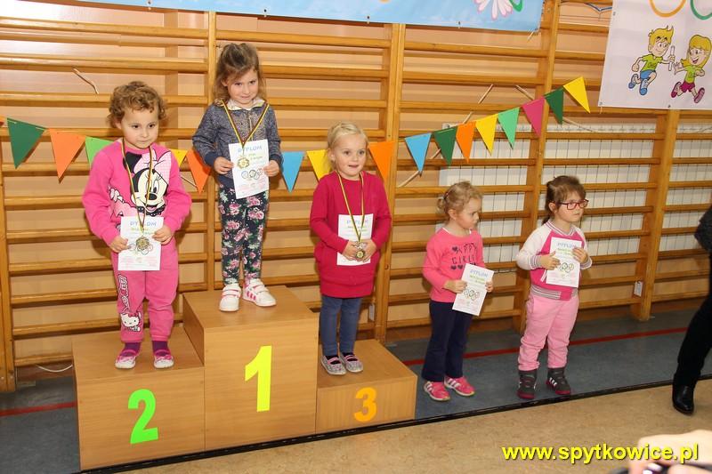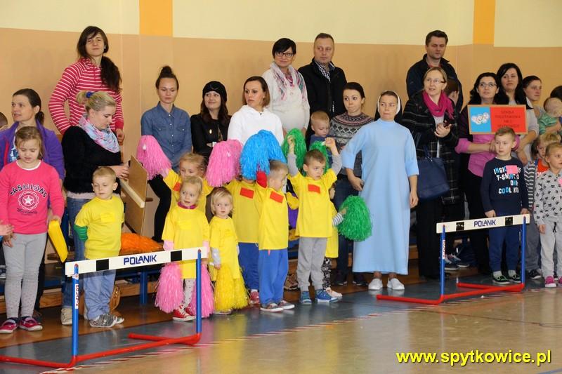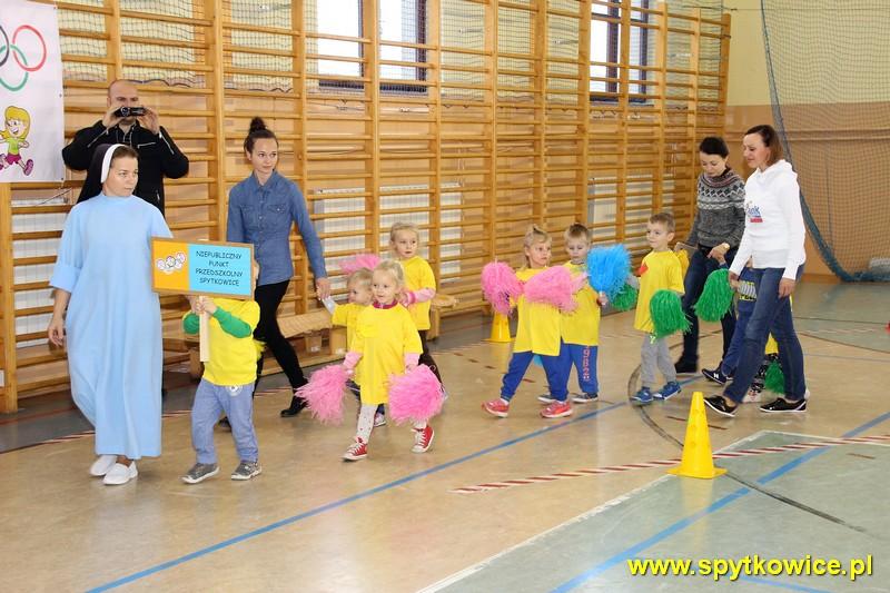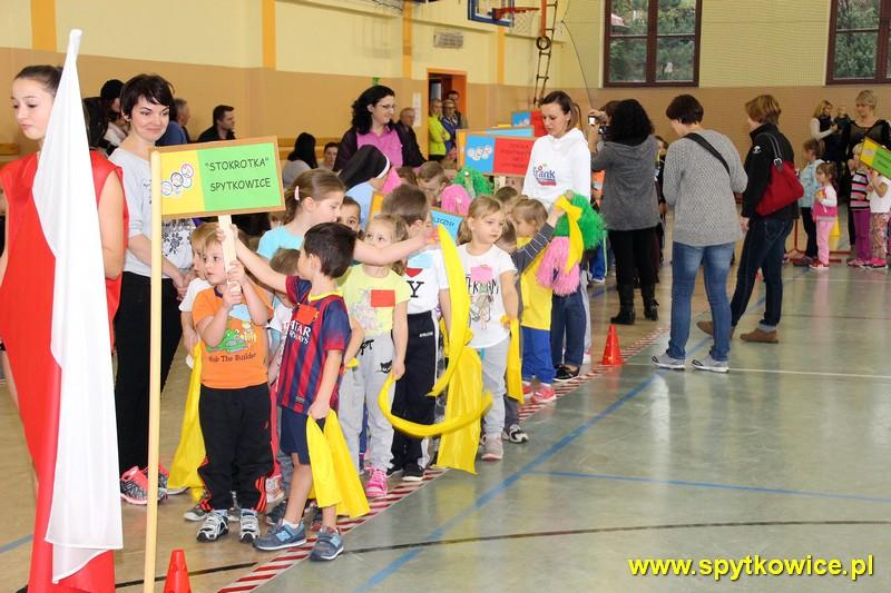 20. 11. 2015r. odbyła się Międzyprzedszkolna Olimpiada Sportowa w Spytkowicach. To już dziesiąty raz kiedy mieliśmy okazję być organizatorami tej imprezy. Jak przystało na Olimpiadę, imprezie nadano iście olimpijską oprawę. Rozpoczęto ją od uroczystej inauguracji, której dokonali dyrektorzy zaproszonych placówek przedszkolnych oraz Przewodniczący Rady Gminy Spytkowice Pan Józef Kościelniak. Następnie odbył się przemarsz wokół hali sportowej 10 drużyn. Przed każdą drużyną zawodnicy trzymali transparent z nazwą przedszkola. W Olimpiadzie wzięło udział ponad 100 przedszkolaków (3,4,5 i 6-latków). Zadaniem zawodników było jak najszybsze pokonanie toru przeszkód: bieg pod płotkiem, przejście przez przeszkodę oraz tunel. Dzieci 5,6-letnie tor przeszkód pokonywały 2 razy. Przedszkolaki z wielkim zaangażowaniem i przejęciem rozgrywały poszczególne konkurencje. W oczekiwaniu na dekorację zwycięzców wszystkie dzieci uczestniczyły we wspólnej zabawie. Najpiękniejszy moment olimpiady to dekoracja najlepszych sportowców. Zwycięzcy otrzymali medale oraz pamiątkowe dyplomy, które wręczył Wójt Gminy Spytkowice – Pan Ryszard Papanek oraz dyrektor Gminnego Przedszkola „Stokrotka” Pani Grażyna Handzel. Olimpiada to świetna zabawa, dużo wrażeń i dobra lekcja aktywności ruchowej więc miejmy nadzieję, że na przyszły rok będzie nas jeszcze więcej!