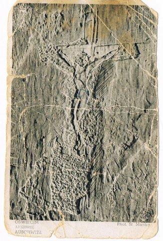 7. Krzyż wyrzeźbiony przez ojca Maksymiliana Kolbe w celi śmierci. Kartka z roku 1947.