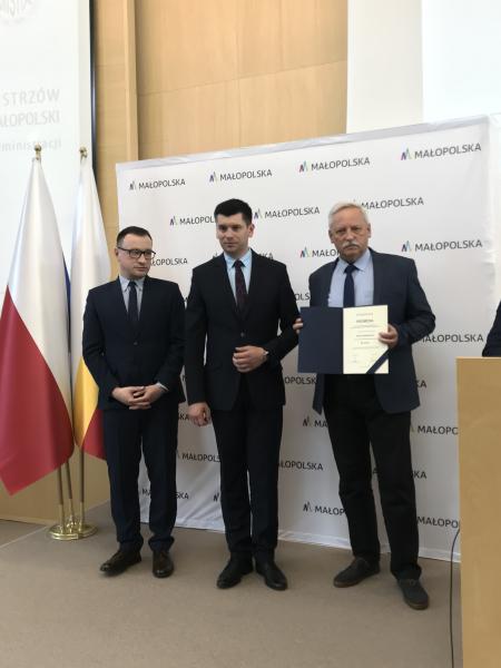 Wójt Ryszard Papanek odebrał z rąk wicemarszałka Łukasza Smółki zapewnienie o dofinansowaniu wynoszącym 63.153,00zł do zadania pod nazwą: Remont drogi gminnej „Słowacka” K364646 w km 0+000 – 0+380.