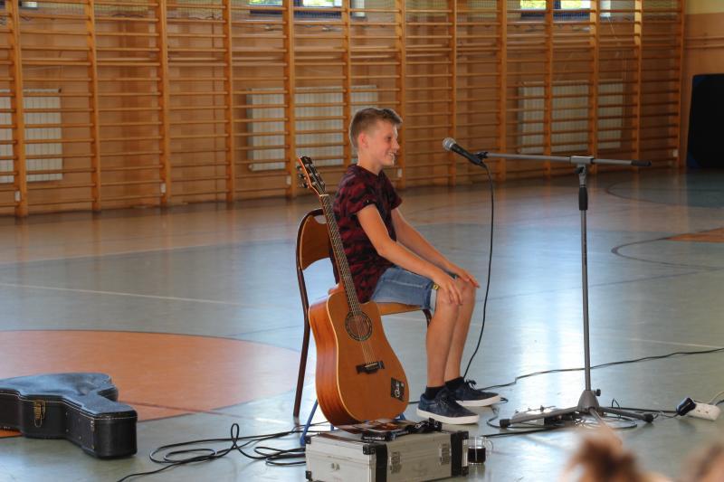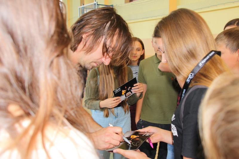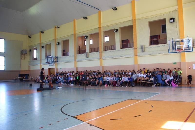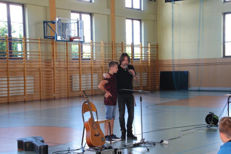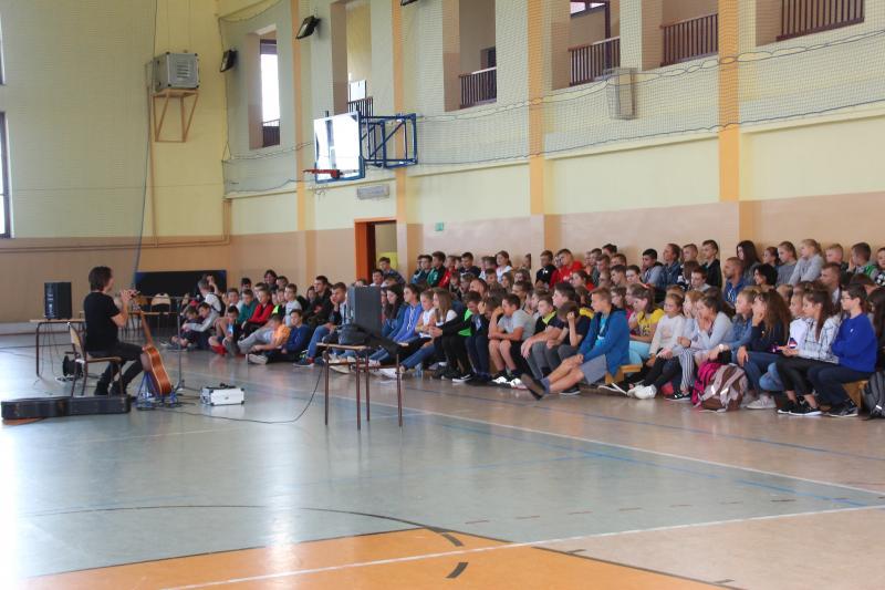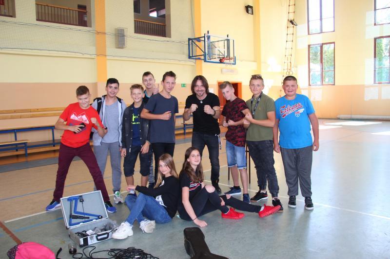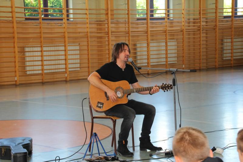Muzyka towarzysząca spotkaniu w wymowny sposób obrazowała poruszane tematy. Można było usłyszeć kompozycje autorstw prelegenta , ale także kultowe przeboje Oddziału Zamkniętego. Po spotkaniu nagrodzono gościa gromkimi oklaskami , a młodzież miała możliwość zrobienia pamiątkowego zdjęcia z artystą i otrzymania autografu .