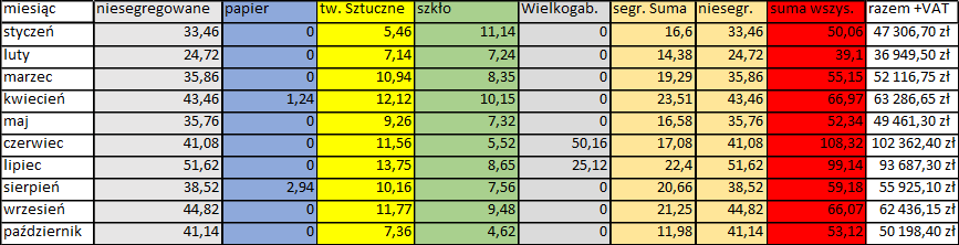 Łączna masa odebranych odpadów od stycznia do października 2020r, wynosi 649,45 ton, zostały również udostępnione Państwu ceny jakie Gmina ponosi w ciągu każdego miesiąca za odbiór odpadów komunalnych w naszej miejscowości. Jak widać w dalszym ciągu przeważa odbiór odpadów niesegregowanych, mimo wprowadzonego systemu selektywnej zbiórki odpadów komunalnych. Dlatego, bardzo prosimy o zwracanie przez Państwa uwagę, co do jakiego kosza wrzucamy, aby tym samym zniwelować ilość odpadów komunalnych niesegregowanych. Jeżeli wyciągając średnią z poprzednich miesięcy, w ciągu roku 2020 zostanie łącznie odebrane ok. 825 ton. Jak widać w roku 2020 do października odebrano więcej odpadów niż za cały rok 2019. Jeżeli tendencja wzrostowa będzie się utrzymywać w takim tempie to przewidujemy, że w roku 2021 z naszej miejscowości zostanie odebrane powyżej 900 ton odpadów. Nie jesteśmy w stanie przewidzieć również ilości wielkogabarytów, w tym roku zostały one odebrane ze względu na pandemię tylko raz, jak będzie w przyszłym roku bardzo trudno przewidzieć. W związku z kończącą się umową na odbiór i zagospodarowanie odpadów komunalnych, został ogłoszony przetarg na rok 2021, do przetargu przystąpiły dwie firmy: FCC Podhale. Ul. Jana Pawła II 115, 34-400 Nowy Targ, oraz KOMBUD FHU 34-242 Łętownia; 378. W związku korzystną ofertą cenową wygrała Firma FCC Podhale z Nowego Targu cena za 1 tonę odpadów wynosi 945 zł brutto. Posiadając już wszystkie dane możemy wyliczyć cenę jednostkową przypadającą za odbiór odpadów ok: 900Mg (przewidziana ilość odpadów w roku 2021) * 945 zł (cena brutto za jedną cenę odpadów komunalnych odebranych z naszej gminy w roku 2021, przez firmę wyłoniona w drodze przetargu) = 850 500,00 zł, jest to przewidziany koszt jedynie samego odbioru odpadów komunalnych, który gmina poniesie w związku z podpisaniem umowy z firmą odbierającej odpady komunalne z naszej miejscowości. W skład kosztów które trzeba doliczyć do gospodarki odpadami należy dołożyć zaopatrzenie w worki, wynagrodzenie pracownika, edukacja ekologiczna, usuwanie odpadów z miejsc nieprzeznaczonych do ich składowania, utrzymanie PSZOK. Łączny przewidziany koszt utrzymania gospodarki odpadami wyniesie ok. 970 000,00 zł . Przewidziany dochód z tytułu gospodarki odpadami, biorąc pod uwagę liczbę osób i wzrost z ceny na 22,50 zł ( przewidziane koszty poniesione w związku z gospodarka odpadami podzielone na liczbe osób z deklaracji 3889) , wyniesie ok. 1 000 000,00 zł, co w całości zostanie przekazane na prawidłowy system gospodarki odpadami. Według ustawy o utrzymaniu czystości i porządku w Gminie dochody z opłat za odbiór i zagospodarowanie odpadów wnoszone przez mieszkańców nieruchomości zamieszkałych powinny zostać zgodnie z art. 6r pkt.2 przeznaczone powinny zostać na: